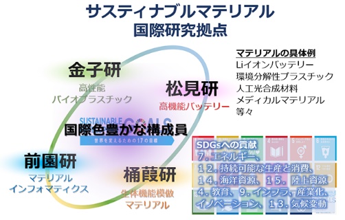 学内に設置されたエクセレントコアサスティナブルマテリアル国際研究拠点において、SDGsに着目したサスティナブル社会を実現するマテリアル科学を推進しています。特に、SDGsに役立つマテリアル開発を目指し、4(教育)、9(インフラ、産業化、イノベーション)、13(気候変動)での国際的な貢献に繋げていきます。