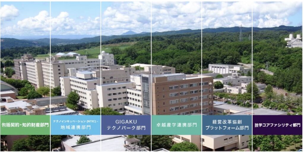 ●包括契約・知的財産部門、 ● テクノインキュベーション・地域連携部門、 ● GIGAKUテクノパーク部門、 ● 卓越産学連携部門、 ● 経営改革協創プラットフォーム部門、 ● 技学コアファシリティ部門