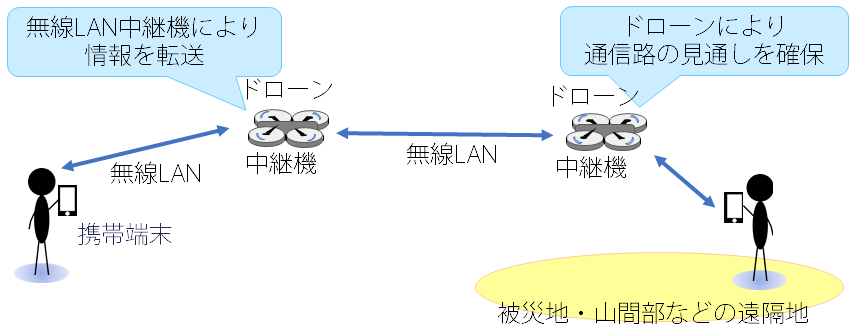 災害時等において既設の通信インフラに依存しない臨時通信システムについて検討しています。無線LAN中継機能を備えたドローンを対象エリアの上空に飛ばすことで通信路の見通しを確保し、遠隔地との無線LAN通信を実現します。