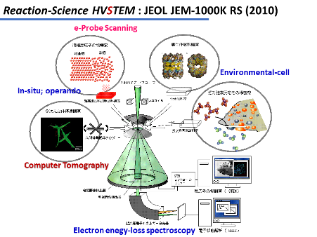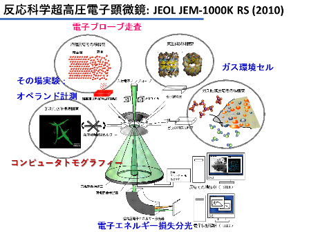 反応科学超高圧電子顕微鏡はガス環境下でのナノレベル物性測定・構造観察の可能な本学が誇る装置です。これまで触媒、電池材料のオペランド計測、水素吸蔵、半導体中の欠陥、宇宙塵の分析などの幅広い分野に無二の貢献を続けています。