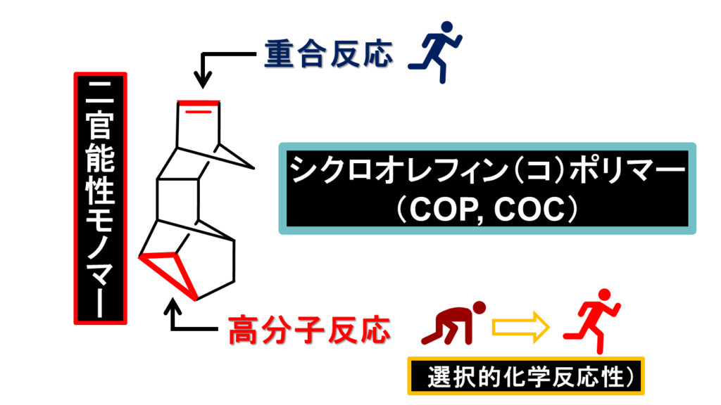 新たに二官能性のノルボルネン系モノマーに着目し、得られるポリマーの修飾反応により、これまでに不可能であった官能基を導入した多彩なポリオレフィン系材料を開発しています。