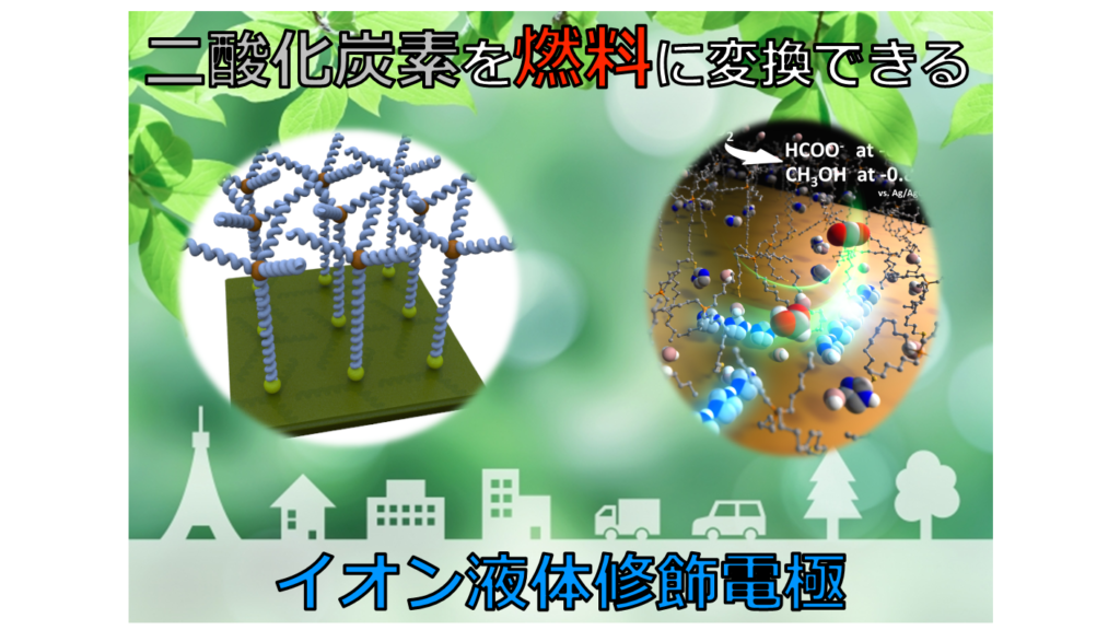 イオン液体は効率よく二酸化炭素の還元反応を起こしますが非常に高価です。私どもは高価なイオン液体の利用を最小限に抑え、効率よく二酸化炭素を他の有用化合物へ変換可能なイオン液体修飾電極を開発しました。