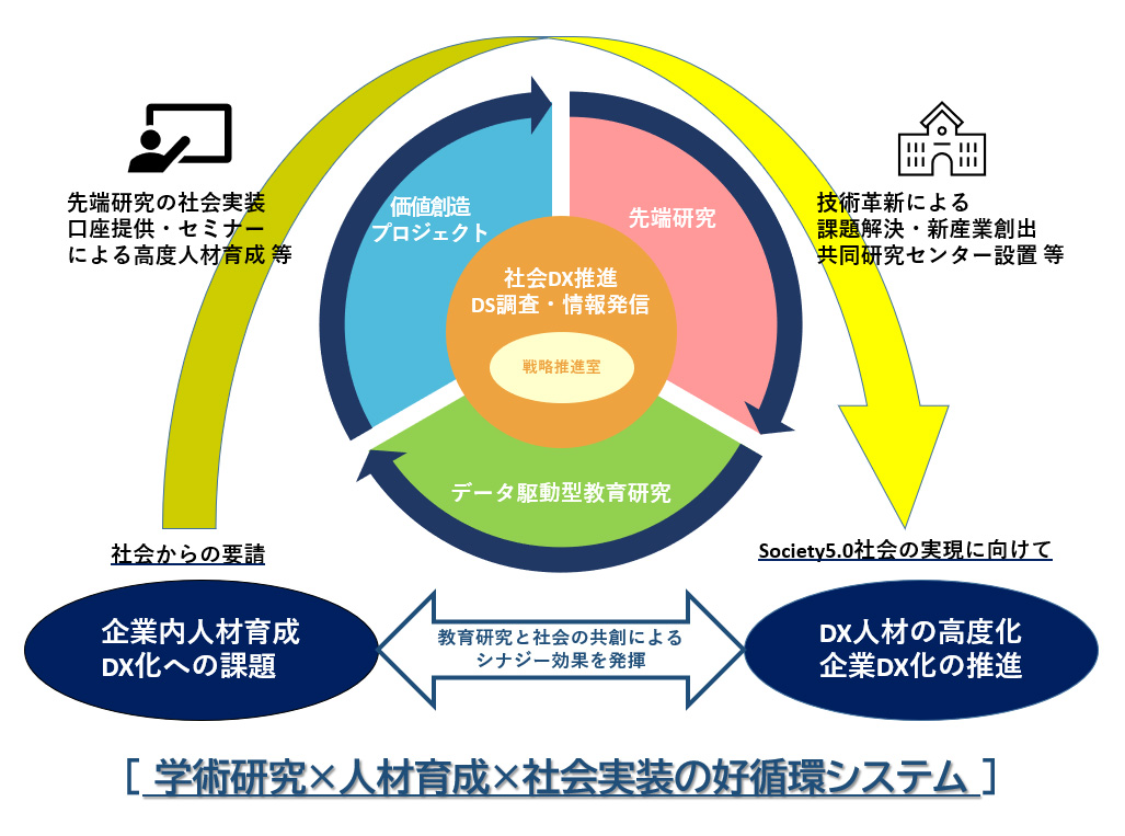当拠点はデータサイエンス・AI領域を牽引する日本最大規模のコミュニティとして、企業・自治体等との連携によるデータサイエンス・AI分野の先端研究の推進やその成果の社会実装による社会課題解決、大学院での企業人育成やリスキリング等による高度データ関連人材の育成などにより未来創生に貢献する共創拠点です。自治体や経済界、金融機関、他大学等との産官学連携を提携、企業等と連携コンソーシアムを構築しており、組織間の連携や活用事例の共有などによるオープンイノベーションを創出しているほか、社会人・学生の人材交流を進め、地域のイノベーション創出の場を提供しています。