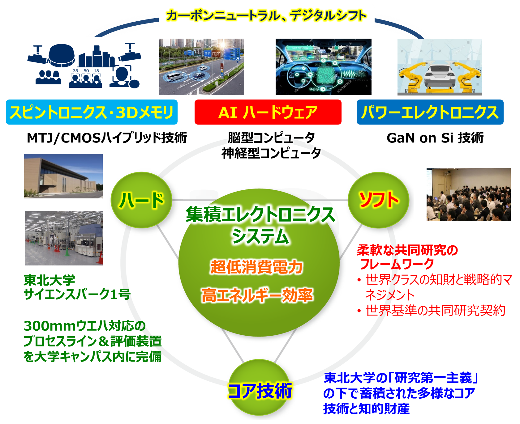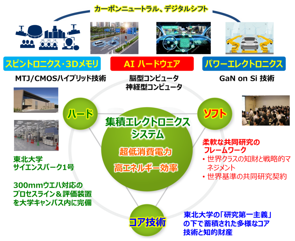 次世代集積エレクトロニクスシステム分野、特に(1)スピントロニクス・3Dメモリ、(2)AIハードウェア及び(3)パワーエレクトロニクスを中心とした先端技術に対する国際産学コンソーシアム(CIESコンソーシアム)による研究開発を通じ、カーボンニュートラルやデジタルシフトの実現に欠かせないエッジコンピューティング、カーエレクトロニクス、AIシステム等の技術における我が国の国際的競争力強化、当該分野技術の実用化及び新産業の創出に貢献します。